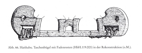 In Hedeby there have been a number of wooden handles found. The current theory is these are handles of bags. It makes sense, because these are found in pairs. Unfortunately the only thing that has been found attached to these handles is some fibres on one of the handles.