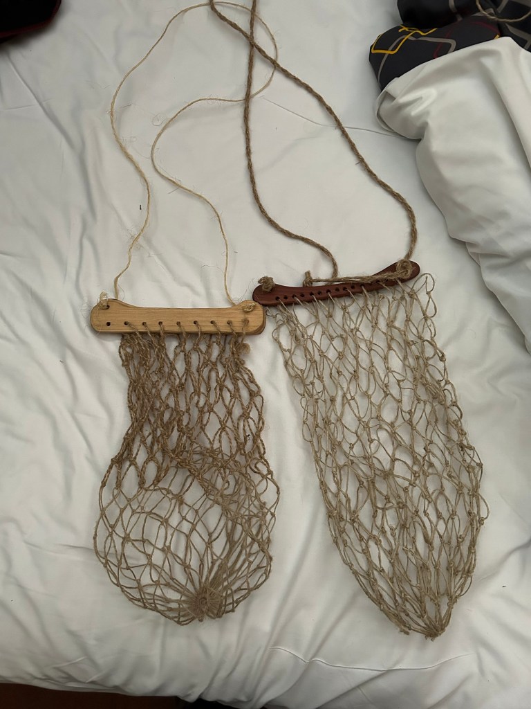 I have seen many different interpretations for a bag attached to the handles (and I have even made one myself with wool I have woven). But for this new interpretation I am basing my theory off the fact that some of the handles only had holes and not slots. For this interpretation I have chosen a net bag.