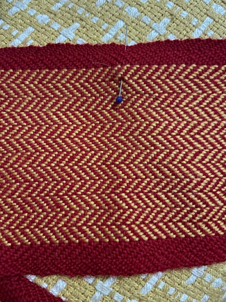 Now comes the scary part. Cutting the fabric in half (because I weave a pair together and then cut them on half). This can be a bit scary but trust your weaving. It’s now like normal fabric. To figure out half way I like to fold it in half and then pin. Then I fold it again to make sure I got it in the right location.