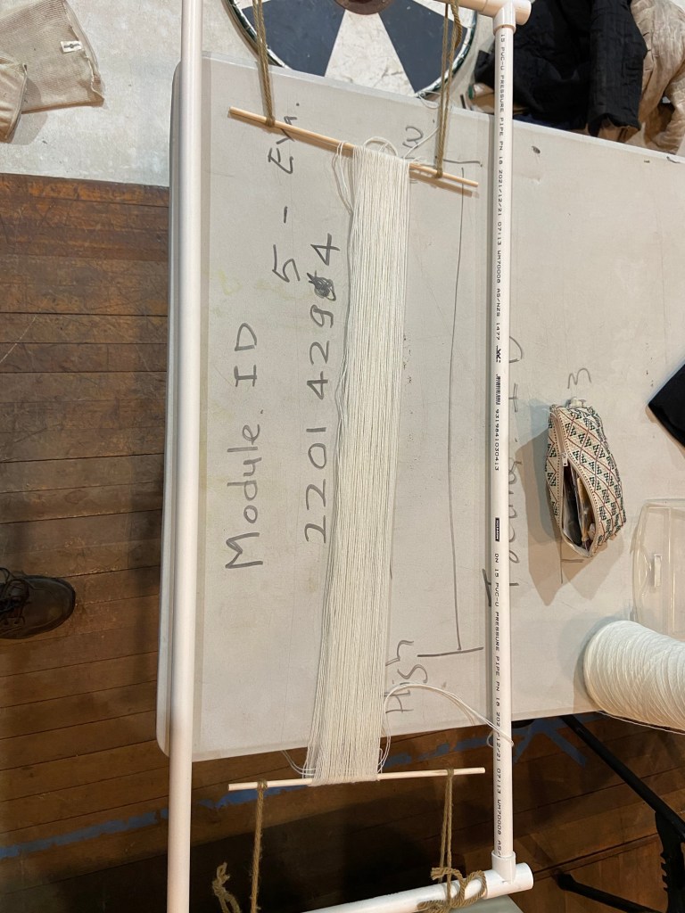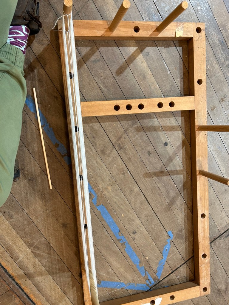 Warping up is very simple. Just wind out the wool between two pegs